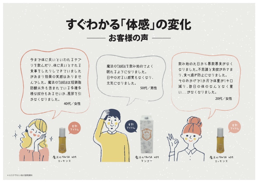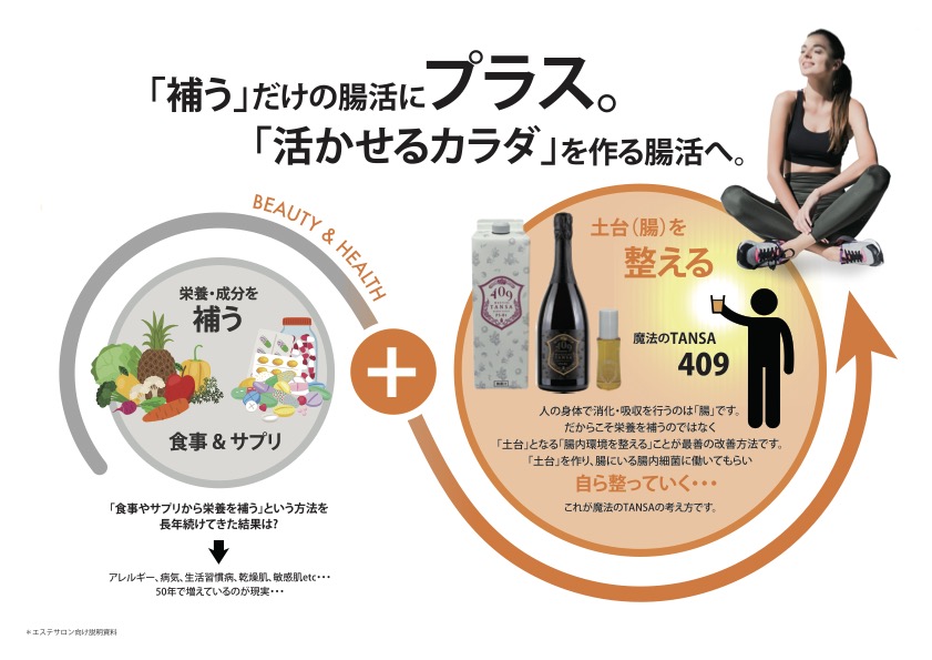 美容・健康に大きく関わる腸内環境を整えることが、今とても重要視されています。魔法のTANSA 409は「短鎖脂肪酸」を含む、409種類の「乳酸菌生産物質」が含まれています。